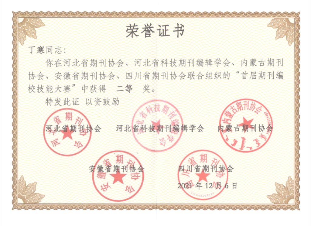 此外,培训期间,河北省期刊协会、河北省科技期刊编辑学会、内蒙古期刊协会、安徽省期刊协会、四川省期刊协会联合组织了“首届期刊编辑编校技能大赛”,我校编辑老师丁寒在此次大赛中荣获二等奖。